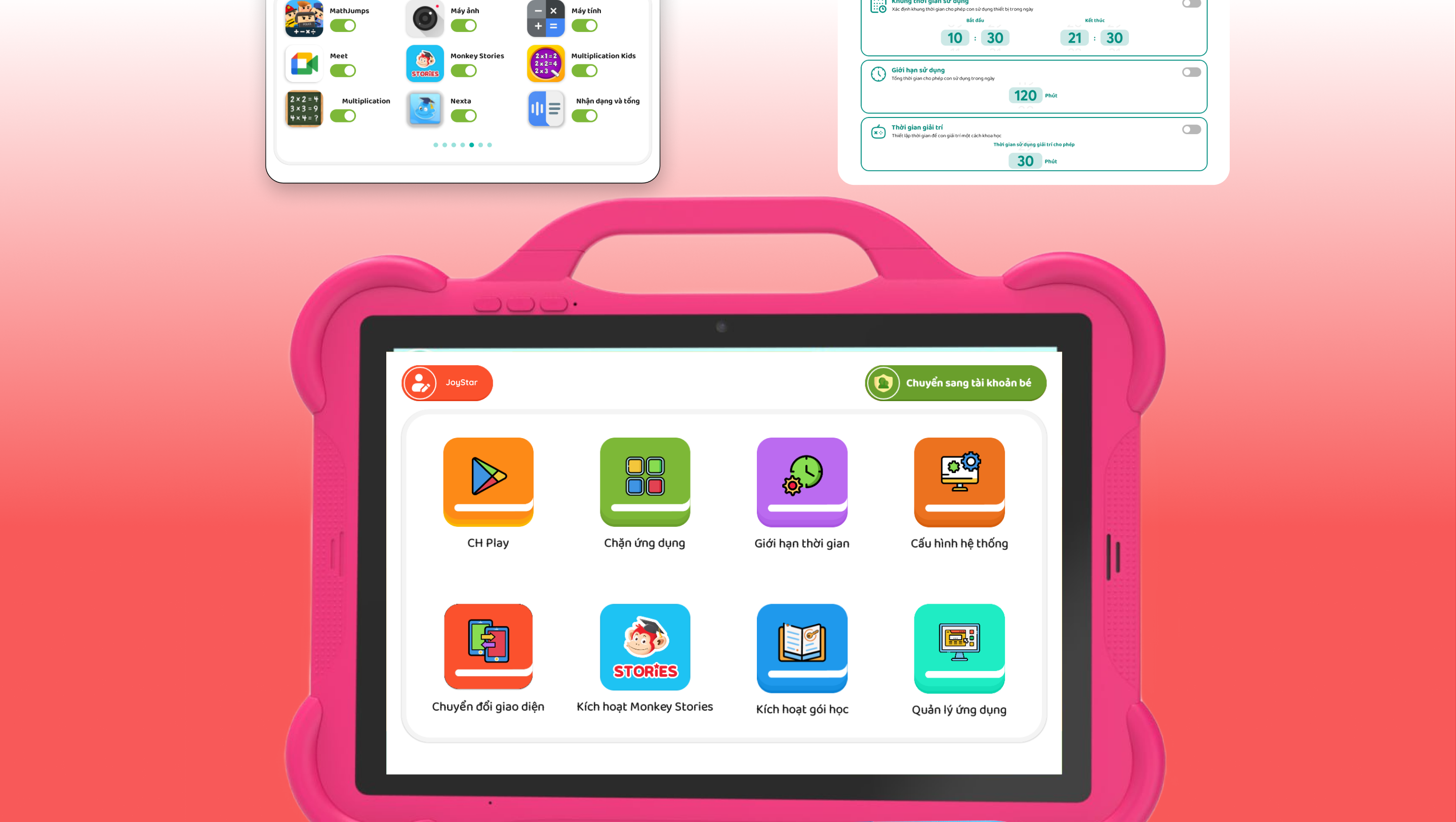 Joystar J10 tích hợp phần mềm quản lý thời gian, cho phép phụ huynh thiết lập và kiểm soát thời gian sử dụng của trẻ. Điều này giúp ngăn ngừa...